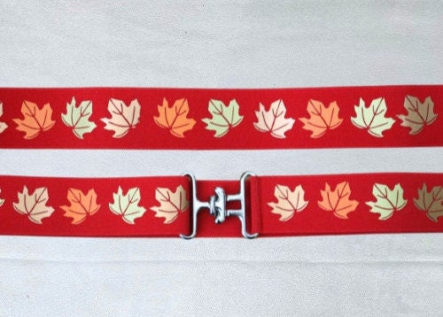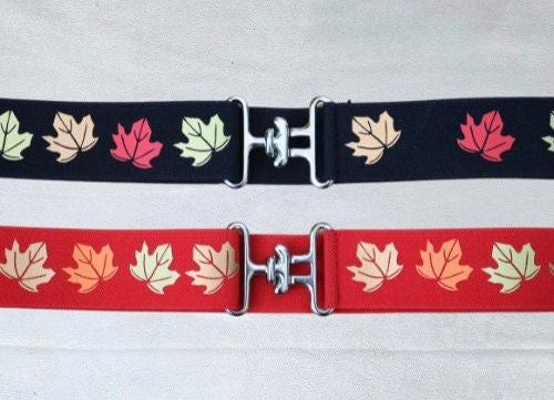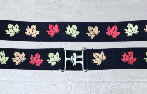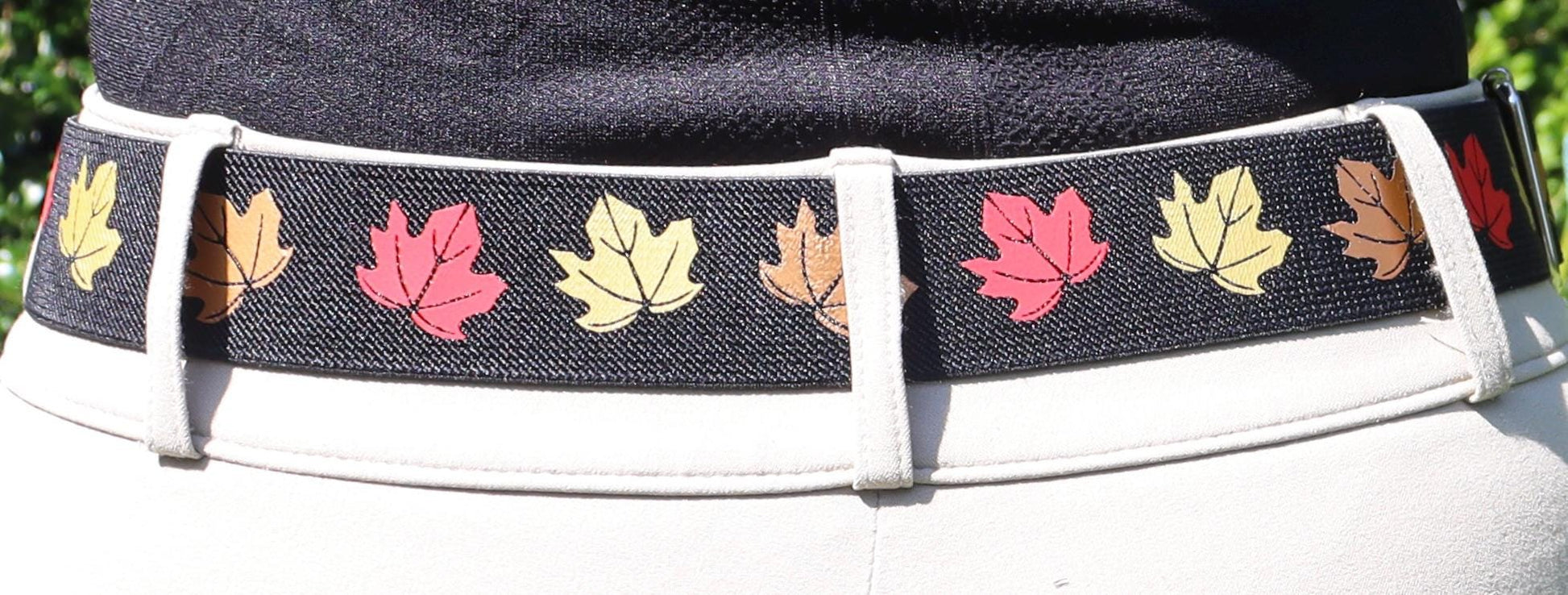 This pretty belt features autumn leaves on black or red elastic. This comfortable belt is adjustable with a surcingle buckle and slide.